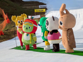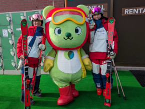 デモンストレーション滑走では、スキーは岡部哲也さんの華麗な滑りや スノーボードは橋本道代さんと今井勇人さんのかっこいい滑りを見て、アルクマも滑りたくなっちゃった!!