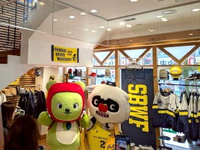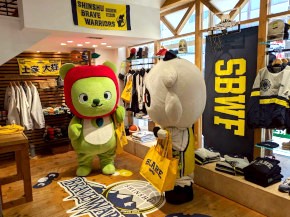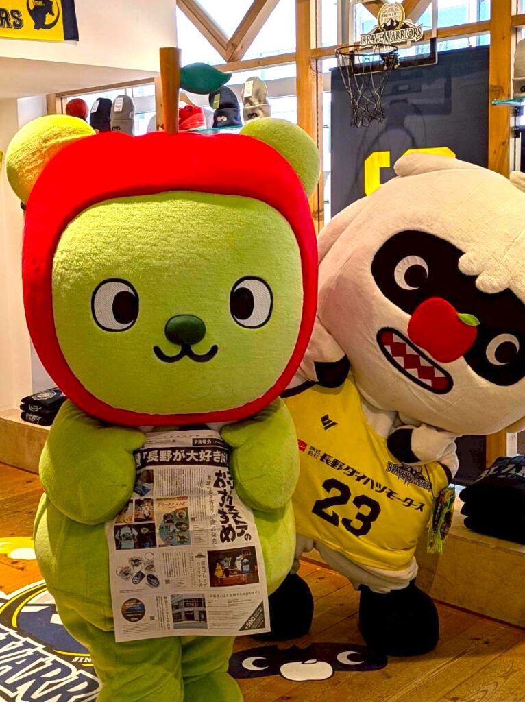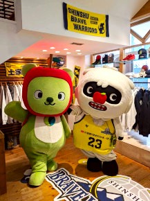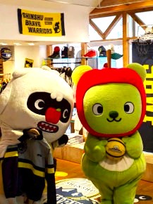 『信州ブレイブウォリアーズ』とのコラボの第2弾。”もし信州ブレイブウォリアーズがアメリカの大学チームだったら?”をテーマにした商品を「ブレアー」と一緒にショップでPRしてきたよ。